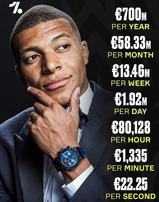 Media-te tarlan danin, Mbappe hian Al-Hilal hi zawm ta se kum khata a hlawh tur hi euro maktaduai 700 tehreng a tling dawn a, thla khatah euro maktaduai 58.33 hlawhin, chawlhkar khata a hlawh tur zat chu euro maktaduai 13.46 a ni ang a, nikhata a rate pawh euro maktaduai 1.92 la tling phain, darkar tin euro 80,128 hlawh kaiin, minute tin euro 1,335 a la pha ang a, second khata a hlawh tur pawh euro 22.25 a la ni fang dawn!