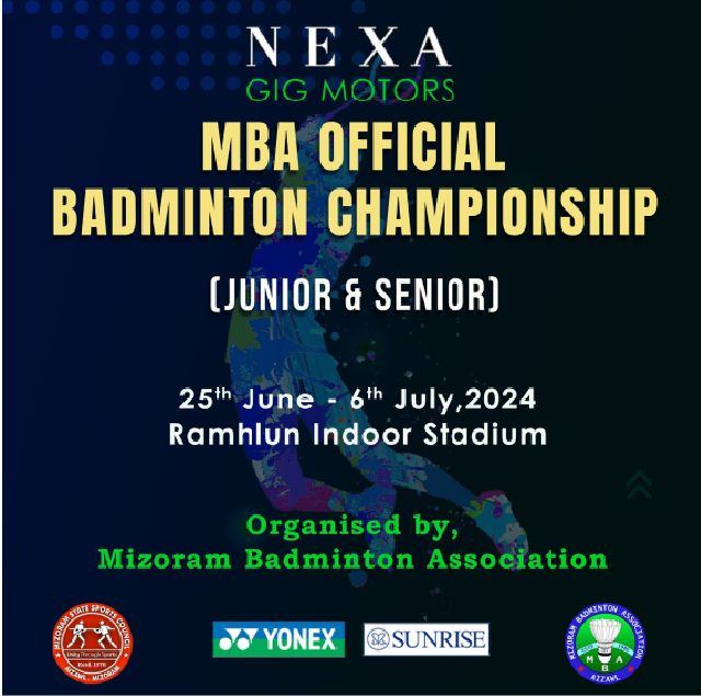 Mizorama badminton inelna ngaihlut hlawh ber leh lian ber, player-te paw’n champion an chakna ber tournament ni bawk NEXA GIG Motors MBA Official Championship 2024 (Junior & Senior) chu vawiin, June ni 25, 2024 atang hian Ramhlun Indoor Stadium-ah khelh tan a ni dawn.